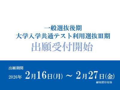 入試 一般選抜後期および大学入学共通テスト利用選抜Ⅲ期の出願受付を開始しました。2026.02.02