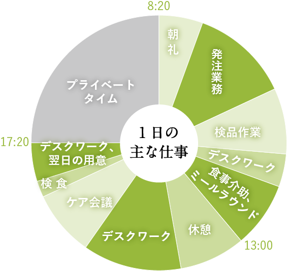 夕方から朝にかけての利用者さんの様子を引き継ぎます。その後、施設スタッフと相談しながら必要に応じて献立や食事形態の変更、ショートステイで入所される方の食事の内容などを厨房のスタッフに伝えます。