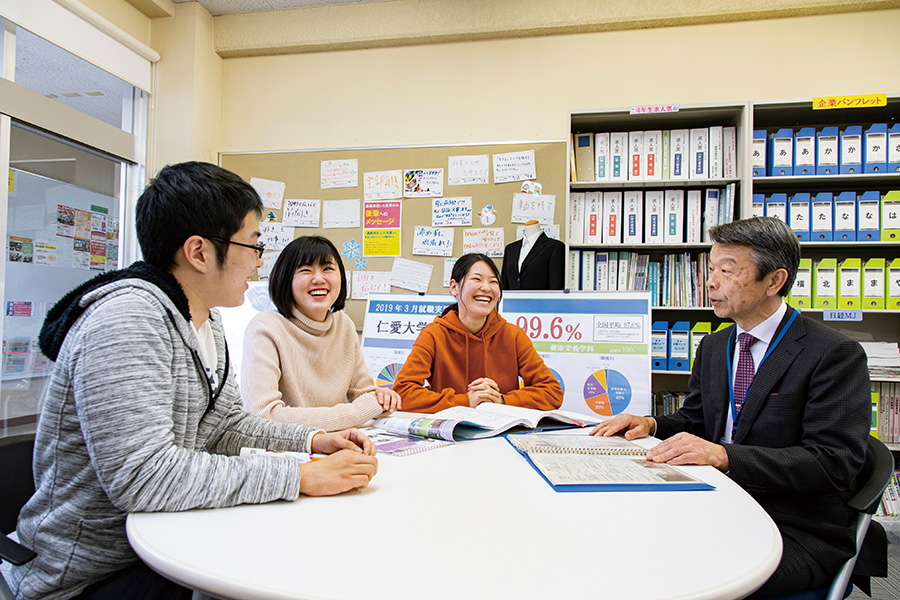キャリア支援センターでは、仁愛大学の「人と人の和のふれあいを目指した人間形成」という建学の精神の下、社会で求められる豊かな人間形成の一環として、学生一人ひとりが能力を発揮し自己実現するにふさわしい就職ができるようなキャリア支援を重視しています。