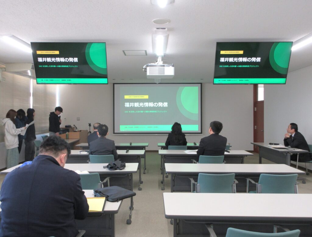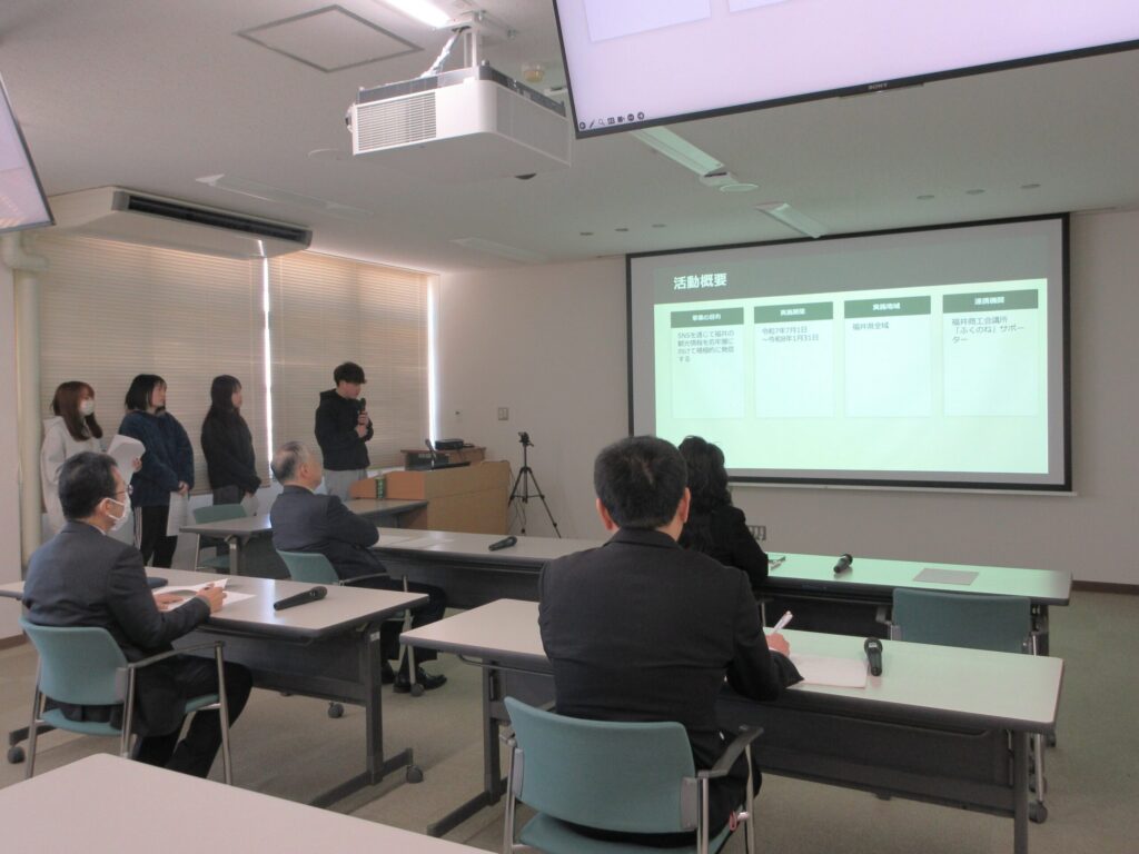 報告会では、「SNSによる福井観光情報の発信」を行った寺田ゼミの学生たちが取り組み内容を発表しました。