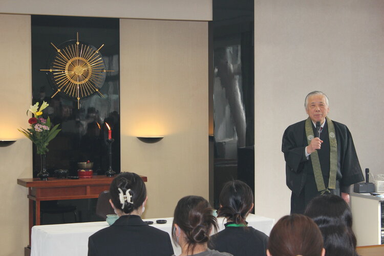 読経と焼香が終わると田代学長より、「東洋の思想では、生きとし生けるもの、すべての命は平等であると考えます。しかし、私たちは研究や学習のために、その命を奪わなければならない。生き物は死ぬために生まれてきたのではありません。すべての生き物は生きるために生まれてきたのです。本来、生きるために生まれてきた命を、自分たちのために奪ってしまう。そこに強い「痛みの心」を持つことこそが、人間としての営みです。仏教には、殺生をしてはいけないという戒律があります。手を合わせ、真理の前に跪くことこそが、強い「痛みの心」を形に表していくことになるのです。仏教における仏とは、「智慧」と「慈悲」の働きであり、それを光にたとえています。そして、そのはたらきを感じとることができる人は、仏の存在に頷くことができます。生き物を殺してはいけないことがなぜ自覚できるかといえば、仏の智慧によるからです。そのことによって、自分の苦を超えていくことができます。常に、生き物に対する痛みの心を忘れずに持っていただくことが、人間性を回復する道なのです。今日は、その心を胸に刻んでいただきたい。」との言葉が述べられました。