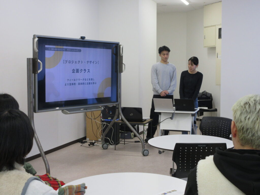 この報告会は、2/19(木)、プロジェクト・デザイン企画コースでの学びを地域に還元することを目的に、学生主導のプレゼンテーション形式で行われました。